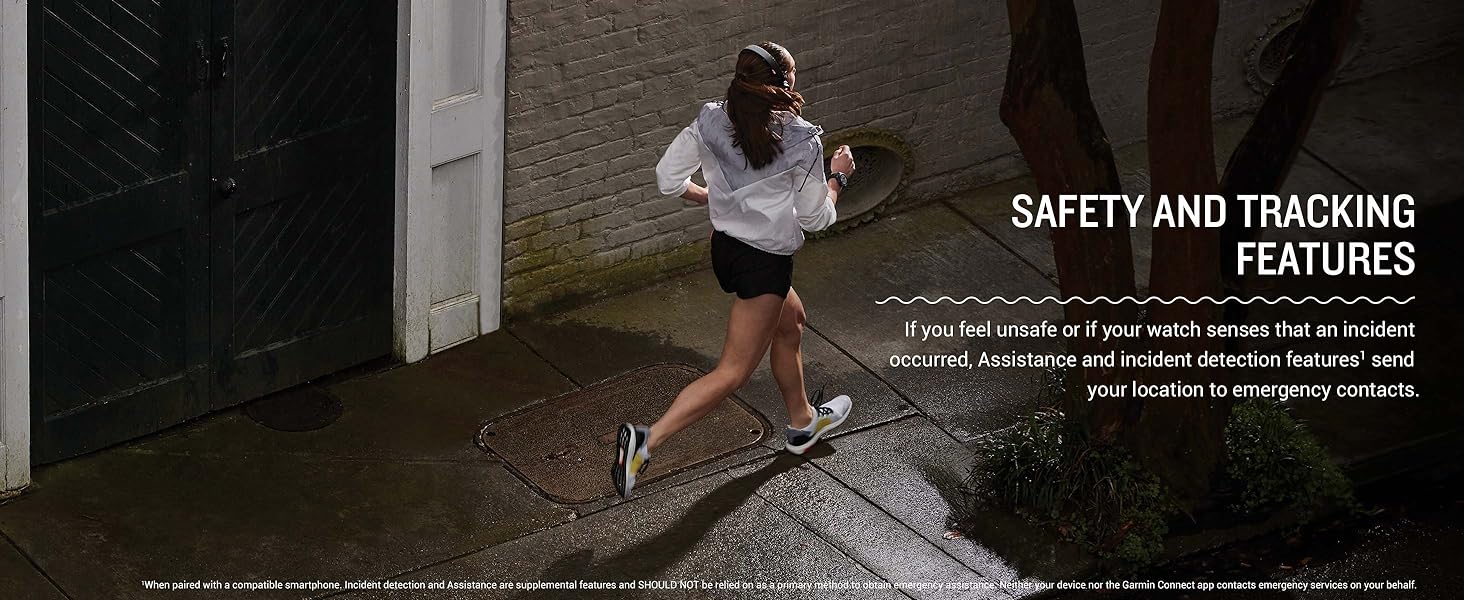- Safety and tracking features include incident detection (during select activities) which sends your real-time location to emergency contacts through your paired compatible smartphone