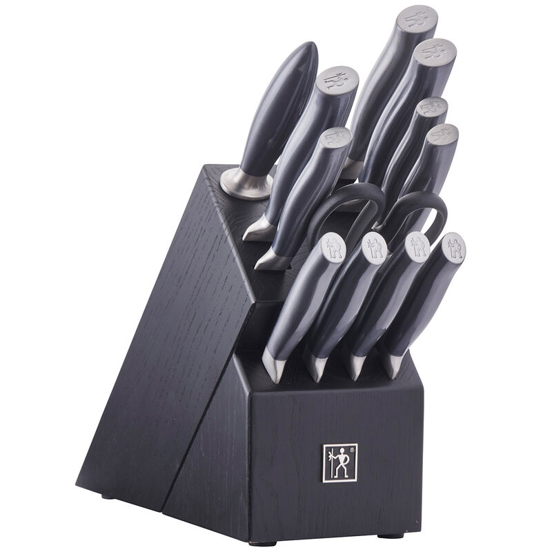 Set Includes: The knife set with block includes 3 and 4-inch paring knives, 5-inch serrated utility, 7-inch santoku, 8-inch chef?s knife, 8-inch bread knife, kitchen shears, sharpening steel, four 4.5-inch steak knives, and knife block