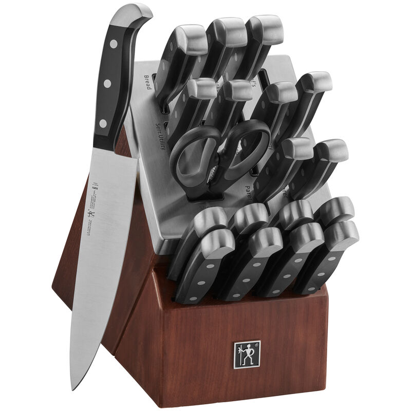 Block features stylish brushed stainless-steel cap and stained ash wood base. Self-sharpening slots labeled by knife type for fine edge knives. Sharpen each time a knife is removed or replaced. The knives in this professional knife set are fabricated from high-quality stainless steel.