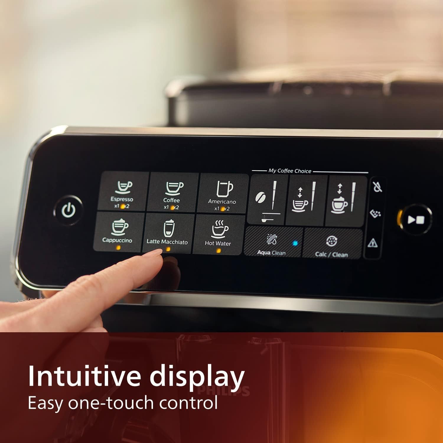 With Philips 3200 Series Fully Automatic Espresso Machine discover the perfect balance of convenience and quality while enjoying the delicious taste and aroma of coffee from fresh beans at home with the perfect temperature, thanks to our intelligent brewing system. Featuring a built-in ceramic grinder, the Philips 3200 Series ensures precise and consistent grinding for optimal flavor extraction. Whether you prefer a strong espresso or a creamy cappuccino, you can personalize your coffee with just a touch thanks to the intuitive touch display. Choose from various coffee options including espresso, coffee, americano, hot water for tea or milk options like cappuccino or latte machiato with ease thanks to our LatteGo Milk System. Cleaning and maintenance is effortless with Philips 3200 Series thanks to the removable brew group allows you to clean it thoroughly just by rinsing it under the tap and the AquaClean water filter ensures up to 5,000 cups without descaling.