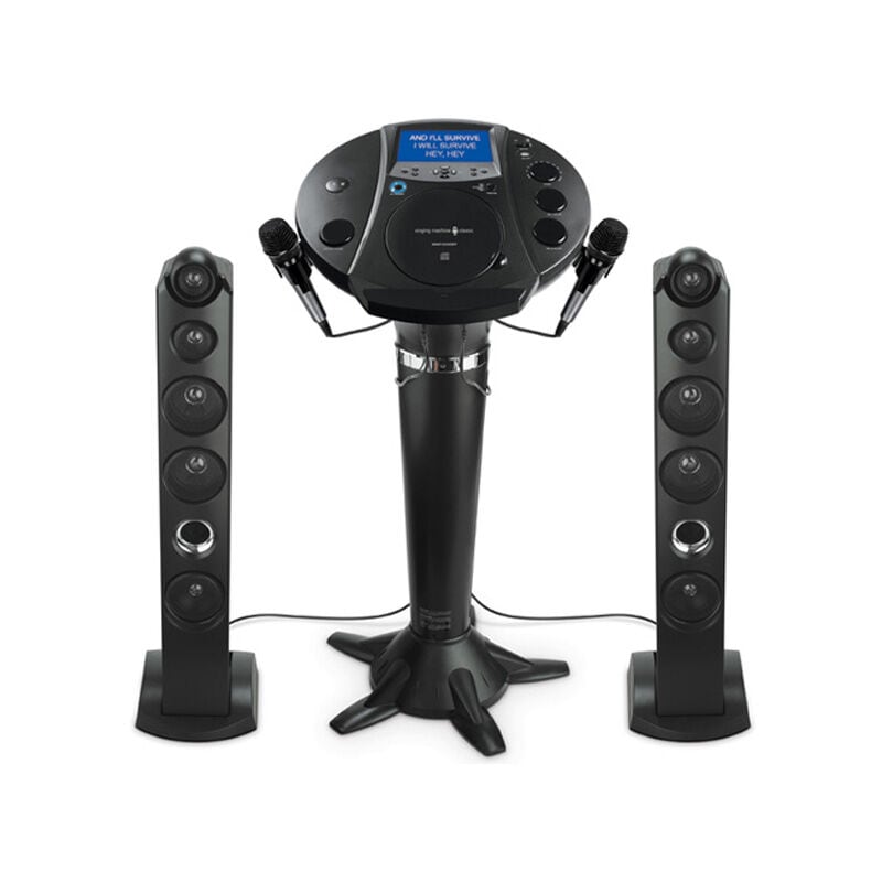 Play your favorite songs from any Bluetooth compatible device or CD+G karaoke player. 7″ LCD built-in monitor. Auto voice control. Digital key control. CD+G karaoke player. USB for digital MP3+G (Play/ Record). FM Tuner. Resting cradle for other devices Includes 2 wired microphones.